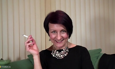 Ravishing mature babe with shaved pussy touching it in an sturdy solo shoot